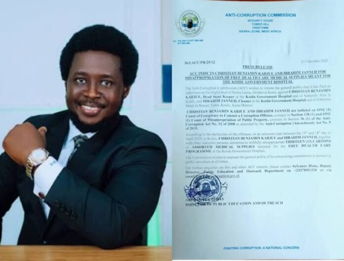 According to the ACC, between April 10 and April 18, 2025, the two, along with other unidentified individuals, allegedly conspired to misappropriate thirteen cartons of medical supplies meant for the Free Health Care Programme at Koidu Government Hospital.
