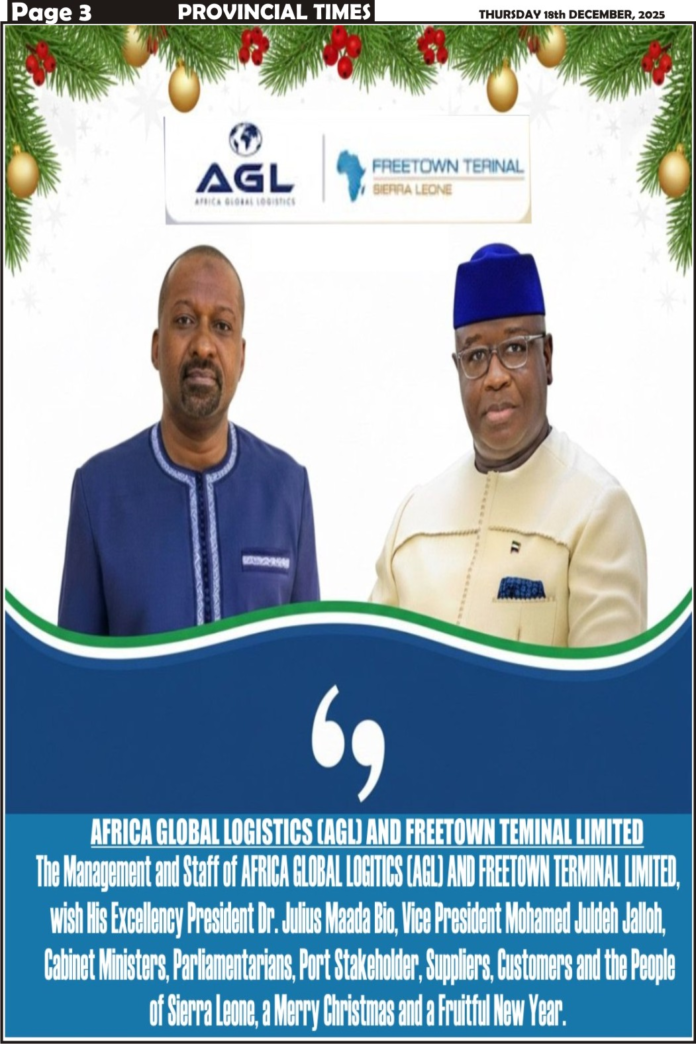 HomeCommercialAGL,FTL SEASON'S GREETINGS Commercial AGL,FTL SEASON’S GREETINGS By Provincial Times Newspaper December 17, 2025 36 0 Share FacebookTwitterPinterestWhatsAppLinkedinEmailPrintCopy URL Share FacebookTwitterPinterestWhatsAppLinkedinEmailPrintCopy URL ABOUT AUTHOR Provincial Times Newspaper RELATED ARTICLES News Crime Surge Threatens Women & Children March 18, 2026 0 News SLRSA Introduces RFID for Smarter Road Oversight March 18, 2026 0 News Theresa Stars At ICC U-19 Women’s Cricket March 18, 2026 0 News FIFA Awards AIK €837K in Transfer Dispute March 18, 2026 0 Load more LEAVE A REPLY Cancel reply Comment: Please enter your comment! Name:* Please enter your name here Email:* You have entered an incorrect email address! Please enter your email address here Website: Save my name, email, and website in this browser for the next time I comment. - Advertisment - Most Popular Crime Surge Threatens Women & Children March 18, 2026 SLRSA Introduces RFID for Smarter Road Oversight March 18, 2026 Theresa Stars At ICC U-19 Women’s Cricket March 18, 2026 FIFA Awards AIK €837K in Transfer Dispute March 18, 2026 Prince Jacob Macauley to Launch National Integrity Scorecard March 18, 2026 Load more - Advertisment - Recent Comments